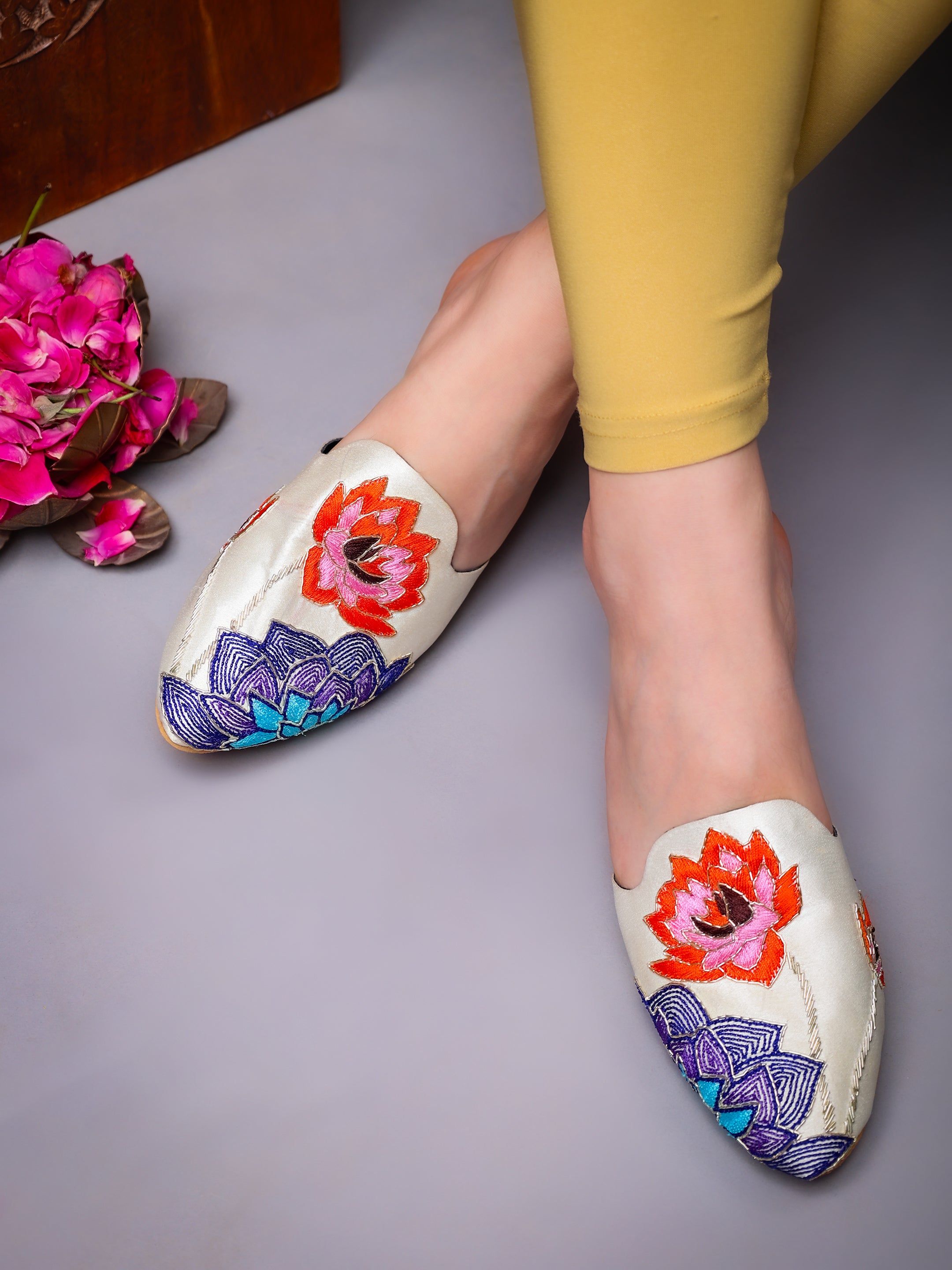Embrace the allure of floral elegance with our 'Floral Zardozi Bloom' White Mules with Heel, and step into a world of timeless beauty and sophistication.