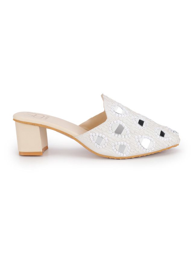 Indulge in the allure of Glam Story's craftsmanship and experience the perfect fusion of luxury and comfort with the 'White Mirror Work Elegance' Metro TPR Mules with Heel. Make a statement with every step you take.