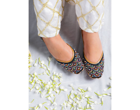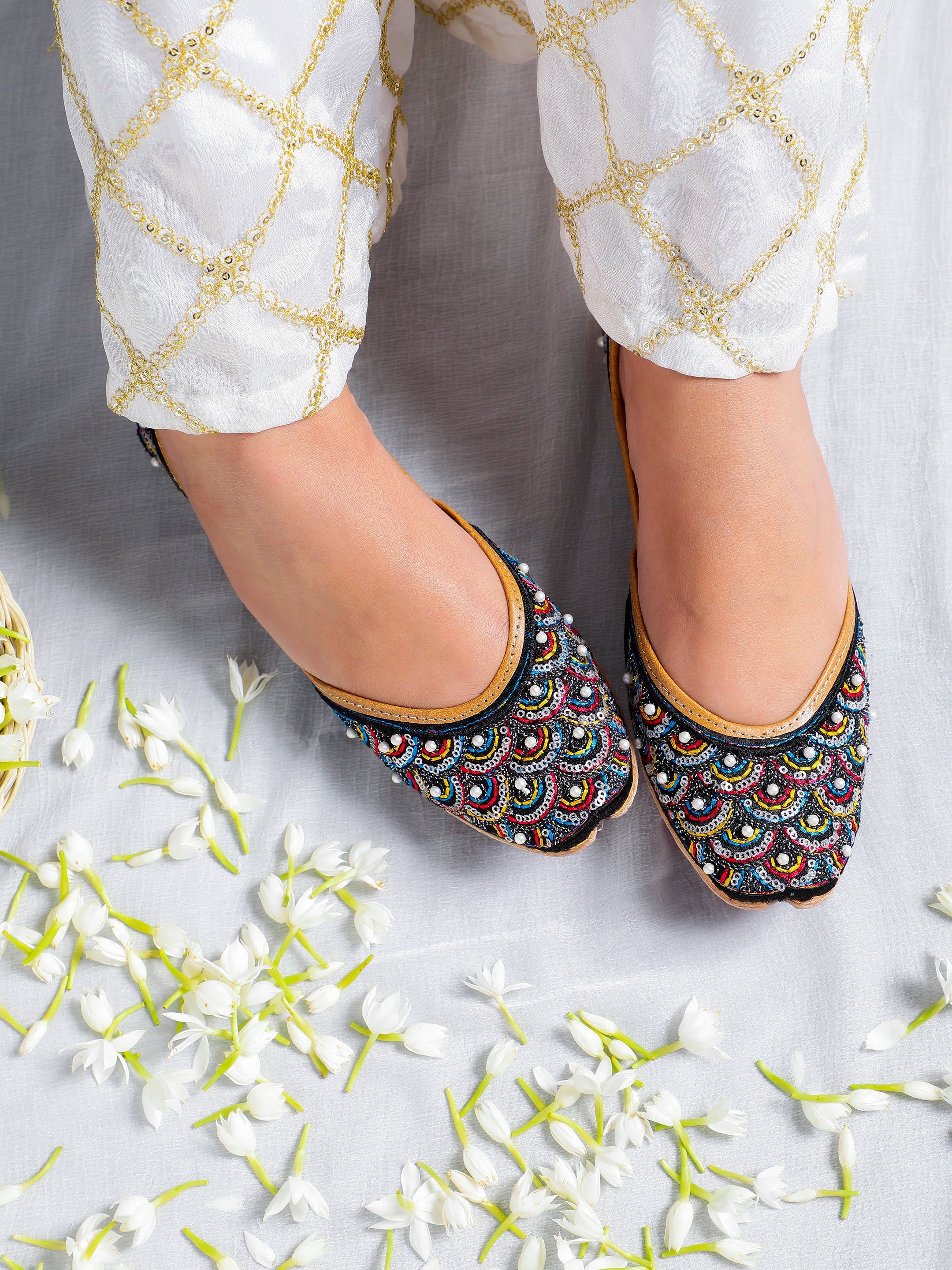 Buy High-Quality women's Punjabi Jutti at Affordable rates. These beautiful punjabi leather juttis are perfect for summer and spring weddings. Your feet will stay comfortable and protected throughout because the inner lining and sole are made of 100% pure leather. No two shoes will be 100% alike and there can be slight irregularities because these are handcrafted. Embellishments are delicate and may fall off with wear and tear. Very Beautiful Perfectly Handcrafted Traditional Premium Authentic Handmade Jutti /Mojari /Juttis for Marriage, Festivals, and Ethnic Footwear.