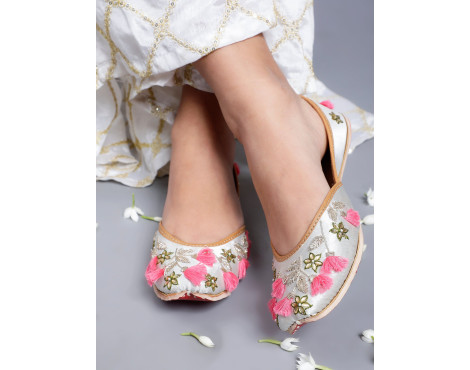 Zhuri White Pink Embroidered Punjabi Jutti